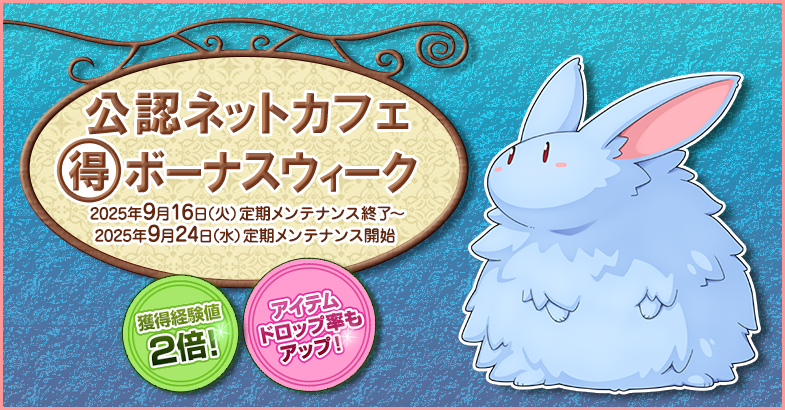 「まる得ボーナスウィーク」は、公認ネットカフェでラグナロクオンラインをプレイすると獲得経験値が2倍になるほか、アイテムドロップ率もアップするお得なキャンペーンです。