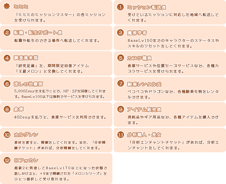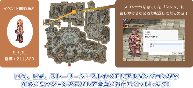 「ミミミのミッションマスター」の会場には、クエストを受けられる「ミミミ」以外にも、回復やステータスリセットなどのサービスを提供している多くのNPCがいます。ぜひご活用ください。