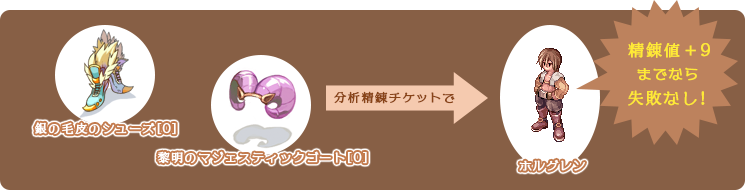 ミッションの報酬として手に入る「分析精錬チケット」を会場にいるホルグレンに渡すと、特別な分析精錬を行ってくれます。分析精錬は特定のアイテムのみに行える精錬で、精錬値+9まで失敗することなく精錬値を上げられます。対象となるのは本イベントで得られる「黎明のマジェスティックゴート[0]」「銀の毛皮のシューズ[0]」の2点。ぜひ精錬値+9を目指して下さいね!