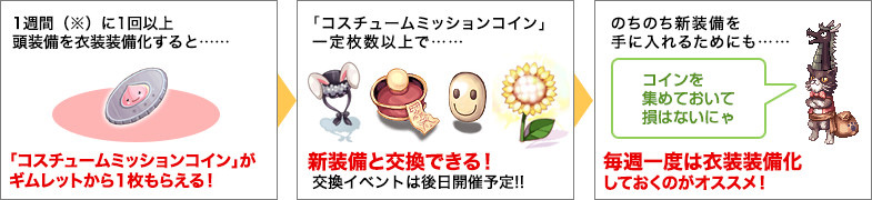 また、毎週1回以上交換すれば、オマケの「コスチュームミッションコイン」がもらえます。どんどん貯めてゲットしちゃいましょう!