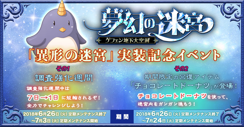 再入場時間が短縮される「調査強化週間」のほか、対象アイテムと期間限定の回復アイテム「チョコレートドーナツ」を交換してくれる「ドーナツお姉さん」が登場します。